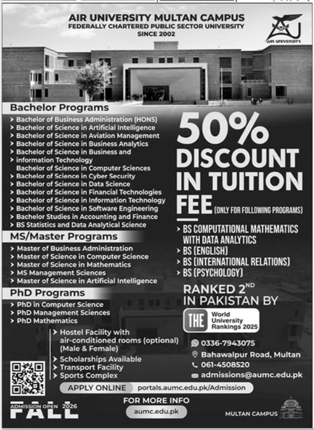 The Air University Multan Campus has officially opened its AUMC Admissions 2026 for the Fall semester, offering a diverse range of undergraduate and postgraduate opportunities. As a federally chartered public sector university ranked 2nd in Pakistan by THE World University Rankings 2025, the institution continues its mission to provide high-quality education in South Punjab.