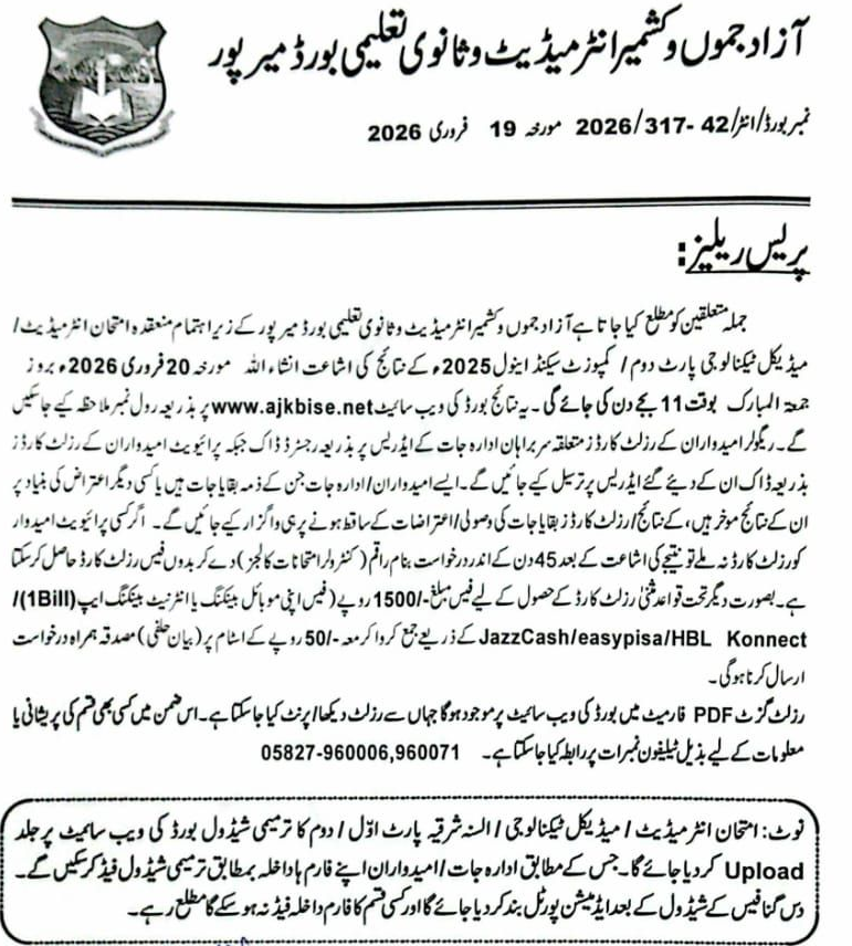 Mirpur, Board of Intermediate & Technical Education Mirpur, Mirpur is making arrangements for the declaration of the Inter & Medical Technology Part-I, Part-II and Composite 2nd Annual Examination Result 2025. The examinations department of the AJK Board has already conducted the medical technology examinations according to the scheduled dates and time. The Board has announced their AJK Board HSSC Part II 2nd Annual Examinations 2025 Result, which will be declared on 20 February 2026 at 11:00 AM and will be available on the official website of the Board.