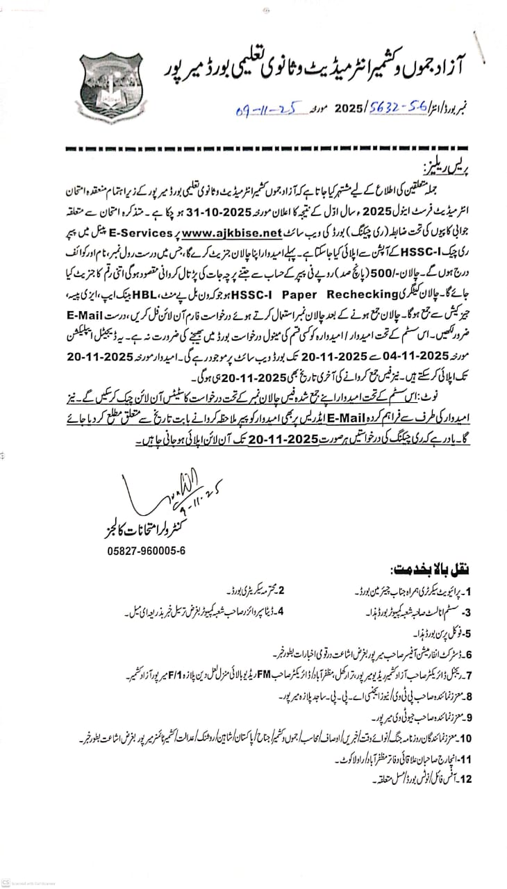 The candidates can reach the official website of the AJK Board online and generate their challan, in which their correct roll no, name and particulars will be mentioned there. The students will have to pay the fee of Rs.500/- per paper, through OneBill payment, HBL app, easypaisa or jasscash apps. The candidates will fill the application forms online by using correct challan no and mention their correct email address. The digital application will be available from 04-11-2025 to 20-11-2025 on the website of the board. The candidates can track their rechecking papers application online at any time.