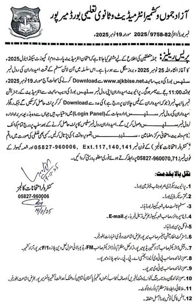 Mirpur, Board of Intermediate and Secondary Education Mirpur AJK completed the process of collection of the admission forms from the regular and private students and now the education board has issued their BISE AJK Inter 2nd Annual Exams 2025 Roll No Slips. The students will download their roll number slips from the official website of the AJK Board as their intermediate class second annual exams for 2025 will be started from 25-11-2025.