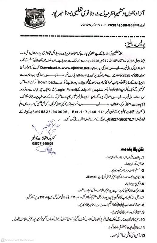 The students will visit the official website of AJK board and they can download their admit cards. The students ensure checking of the particulars so that they can appear in the exams without any hassle. The students will bring their admit cards in the exams halls during their higher secondary school certificate 2nd annual exams for 2025.