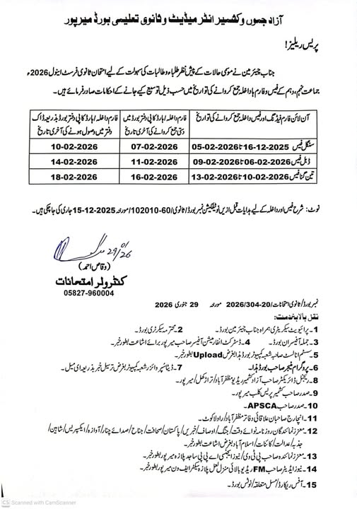 The students can follow this revised schedule for the submission of the admission forms as the AJK Board has fixed the last date with the single fee payment from 16-12-2025 to 05-02-2026. The candidates can also forward their application forms with double fee payment from 06-02-2026 to 09-02-2026. The candidates can also forward their admission forms with triple fee deposit from 10-02-2026 to 13-02-2026.