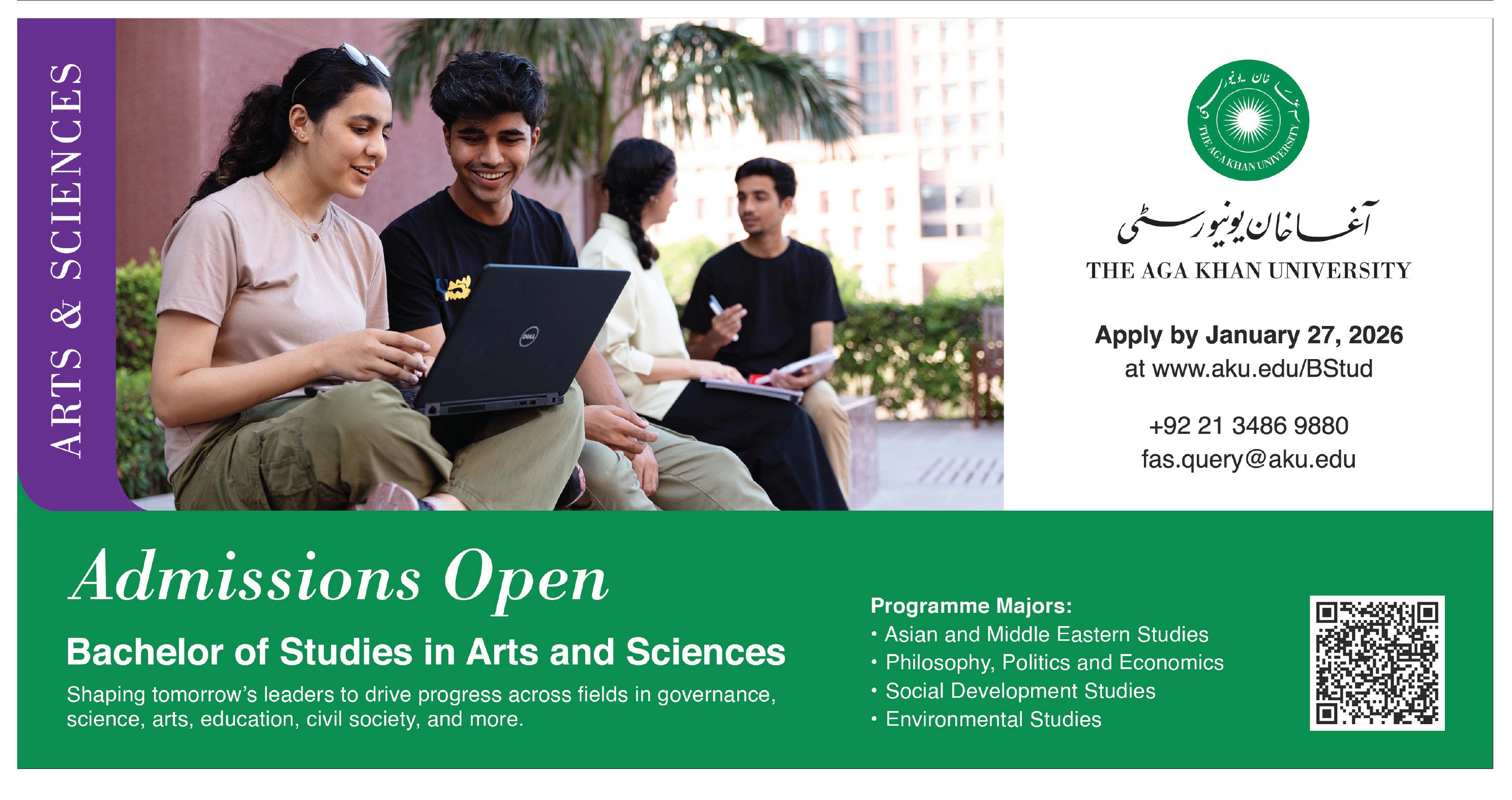 The Aga Khan University AKU invites applications for its prestigious Bachelor of Studies in Arts and Sciences programme. This unique and forward-looking undergraduate degree is designed to cultivate critical thinkers, ethical leaders, and changemakers who will drive meaningful progress across sectors — from governance and civil society to science, education, and the arts.