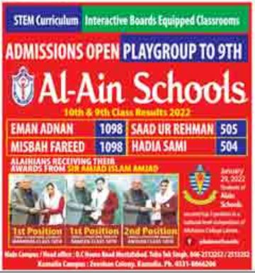 Al Ain Schools Playgroup to 9th Admission 2022 are held. Those students who want to register themselves with Al ain Schools they may contact to administrator as per paper Ad.
