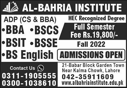 Al-Bahria Institute has announced admission for the year 2022. Al-Bahria Institute is offering admission in programs of BBA, computer sciences, information technology,English. Those student who want to take admission in that program must apply before the the last date. This institution has the highest level education in a better environment.