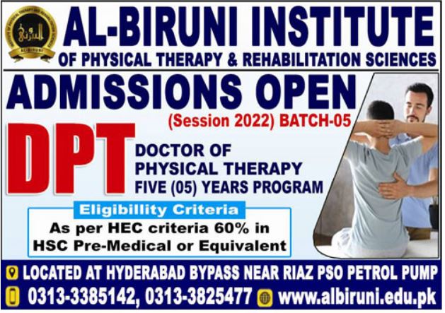 Al-Biruni Institute of Physical & Rehabilitation Sciences Hyderabad is intended to open Admissions and accepting Applications from interested candidates for Admissions to DPT Doctor of Physical Therapy 5 Years Program for Academic Session Spring 2022 Batch-05. Candidates passed HSC Pre-Medical or equivalent with 60% marks are eligible to apply. Admissions are open