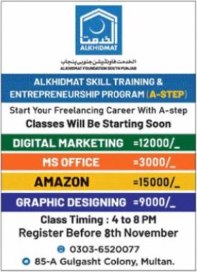 Al Khidmat Skill Training and Entrepreneurship Program Admission 2022 for the courses of Digital Marketing, MS Office, Amazon, and Graphic Designing. Al Khidmat Skill Training and Entrepreneurship Program course pricing plan are these Digital Marketing 12,000, MS Office 3000, Amazon 15,000, and Graphic Designing 9000. The last date to register for these courses is November 8th, 2022.