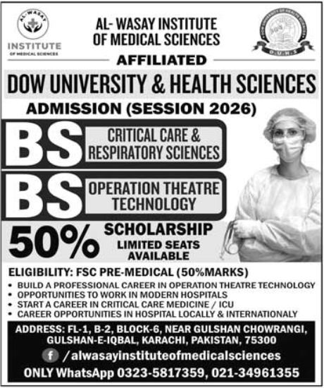 Al-Wasay Institute of Medical Sciences AIMS has officially opened admissions for its 2026 academic session, offering specialized Bachelor of Science BS programs. Affiliated with the world-renowned Dow University of Health Sciences DUHS, the institute provides a premium platform for students to pursue careers in high-demand allied health fields. This intake is a vital opportunity for medical aspirants to gain professional training in critical care and surgical technology.