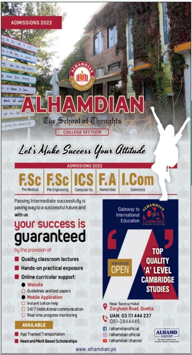 Alhamdian School Quetta is proposed to be offered the Alhamdian School Admissions 2022 for Academic Session 2022 in College Section. Alhamdian the School of Thoughts is looking for applications from interested candidates for Alhamdian School Intermediate Admissions 2022. Alhamdian School FSc Admissions 2022 are open in Pre-Medical, Pre-Engineering, Alhamdian School FA Admissions 2022 are open in Humanities, Alhamdian School I.Com Admissions 2022 are open in Commerce. Scholarships are also available. Alhamdian School Quetta Admissions 2022 are open now.