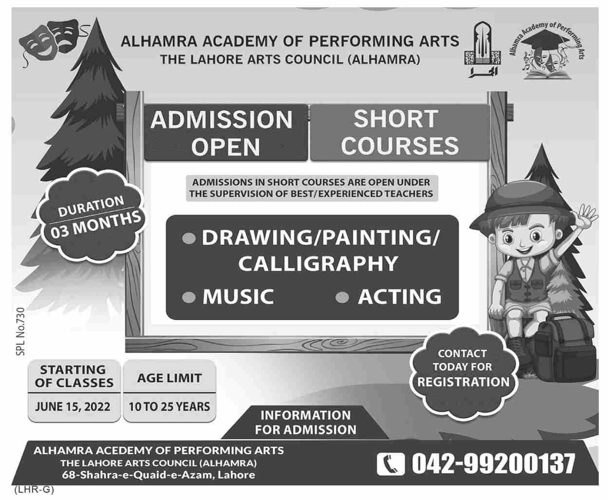Alhamra Academy of Performing Arts Lahore is decided to offer Alhamra Academy of Performing Arts Admissions 2022 and started to accept the applications for Alhamra Academy of Performing Arts Lahore Admissions 2022. Alhamra Academy of Performing Arts Courses Admissions 2022 are announced in Drwaing, Painting, Calligraphy, Music, Acting for the duration of 3 months. Alhamra Academy of Performing Arts Short Courses Admissions 2022 are open under the supervision of best and experienced teachers. Classes are starting from June 14, 2022. Registration is ongoing.