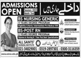 All Saints Nursing Institute is now accepting applications for the 2nd Batch of Admissions for the academic session 2025. The institute offers high-quality nursing education under the supervision of qualified faculty and state-of-the-art facilities.