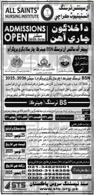 All Saints’ Nursing Institute Karachi Admissions 2025 BSN