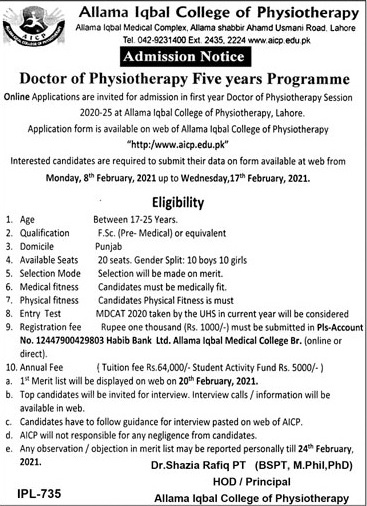 Allama Iqbal College Of Physiotherapy Lahore is seeking Application for Admission in Doctor of Physiotherapy Five Years Programme. Candidates shall apply from 08-02-2021 upto 17-02-2021. 1st Merit list will be displayed on 20-02-2021.