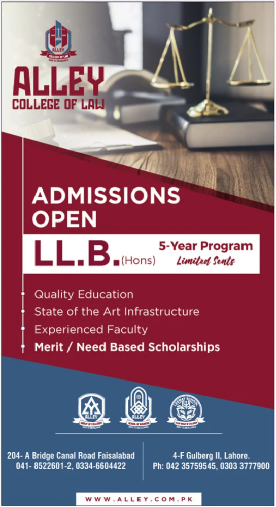 Alley College of Law invites applications for admissions 2021 in LLB Hons 5 years degree program in Lahore and Faisalabad Campus.