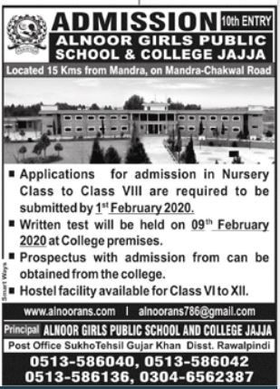 Alnoor Girls Public School & College Jajja Admission 2020