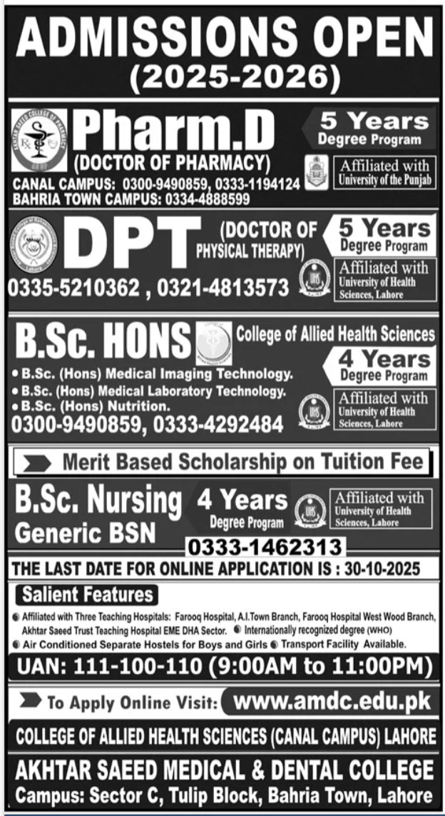 Akhtar Saeed Medical & Dental College AMDC, Lahore invites applications for admission to its Allied Health and Pharmacy programs for the academic session 2025–2026. The college is affiliated with top universities and three well-established teaching hospitals, ensuring students receive a comprehensive blend of theoretical knowledge and hands-on clinical training.