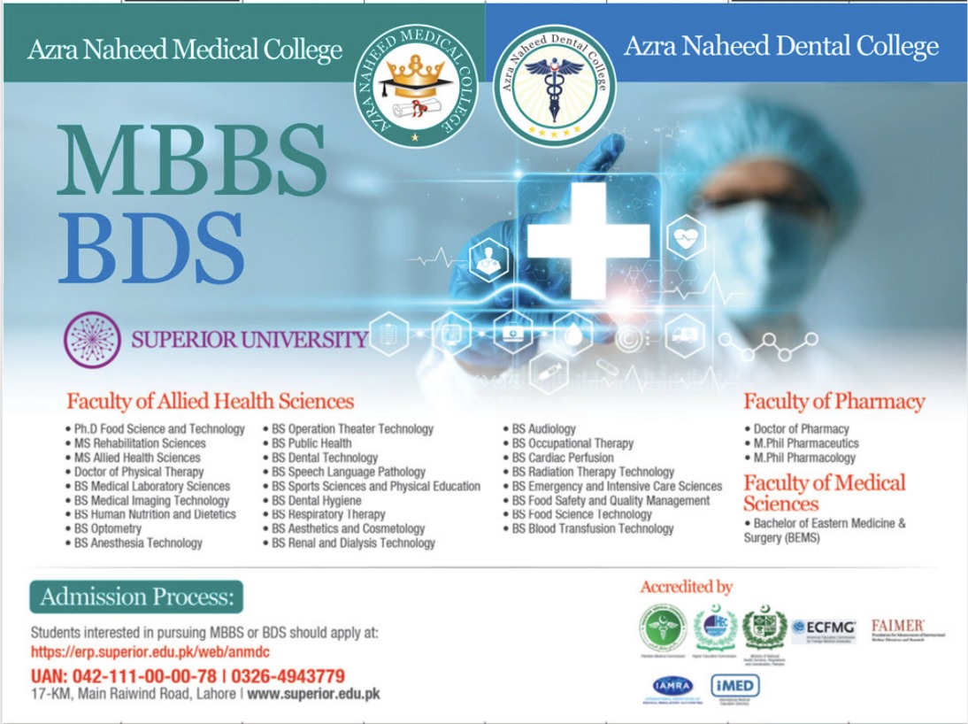 Azra Naheed Medical College, affiliated with Superior University, offers a wide range of programs to cater to your healthcare career aspirations. With a commitment to excellence, accreditation from renowned bodies, and a transparent admission process, ANMC is your gateway to a promising future in the healthcare industry. Pursue your dreams, make a difference, and excel in the world of medicine and allied health sciences with ANMC. Your journey to becoming a healthcare professional starts here!
