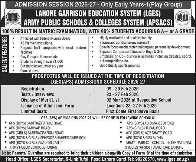 Army Public Schools and Colleges System, Lahore APSACS has officially announced Admissions 2026, opening doors for young learners to begin their academic journey in a disciplined and high-performing educational environment. The admission session 2026-27 is currently available for Early Years-1 Play Group, making it an ideal opportunity for parents seeking a strong foundation for their children’s future education. With a reputation for excellence, APSACS Admissions for Session 2026-27 are expected to attract thousands of applicants across Lahore.