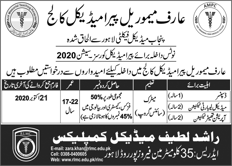 Arif Memorial Paramedical College has announced admissions 2020 in Paramedical diploma courses in Dispenser, Medical Laboratory Technician, Operation Theater Technician in Lahore.