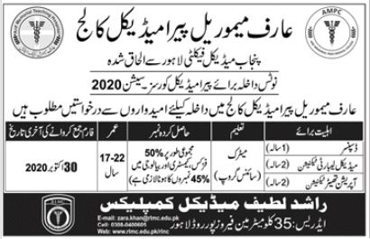 Arif Memorial Paramedical College has announced the admissions for Diploma in Dispenser(1 year), Medical Laboratory Tech(2 years), Operation Theater Tech(2 years) in Lahore. The last date of submission of applications is 30 October 2020.