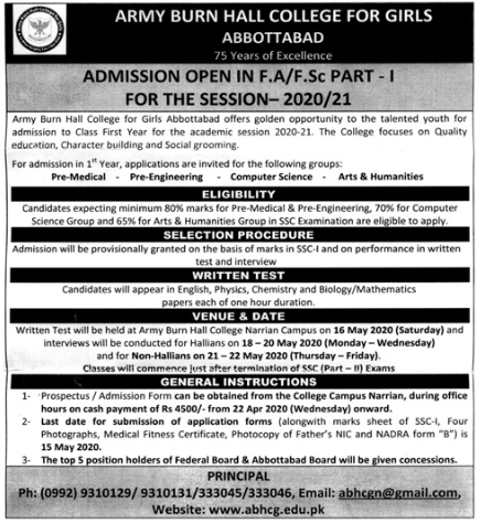 Abbottabad, Army Burn Hall College for Girls invites applications for admissions 2020in 1st year academic session 2020-2021 in Pre Medical, Pre Engineering, Computer Science, Arts and Humanities.Result awaited students can also apply. Written test will be held on 16 May, 2020.