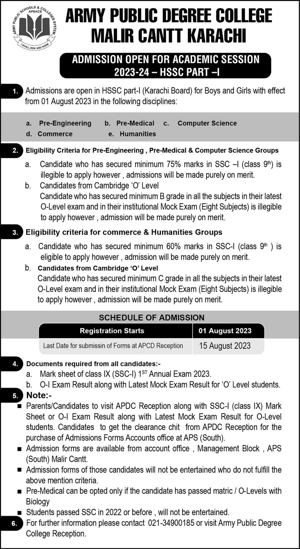 Army Public Degree College Malir Cantt 11th Class Admissions 2023