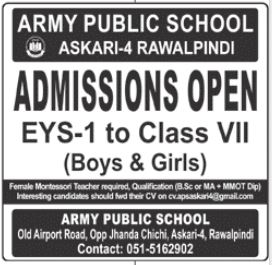 Aspiring parents and educators can seize this opportunity to enroll their children in Army Public School Askari-4, known for its dedication to academic excellence and holistic development. The schools inclusive approach and emphasis on qualified staff highlight its commitment to shaping well-rounded individuals.
