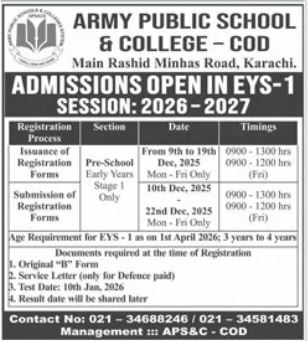 Army Public School & College – COD, located on Main Rashid Minhas Road, Karachi, is pleased to announce that admissions for Early Years Stage-1 EYS-1 for the academic session 2026–2027 are now open. The institution continues its tradition of providing quality education, a structured learning environment, and strong character building—making it one of the most trusted names in academic excellence.