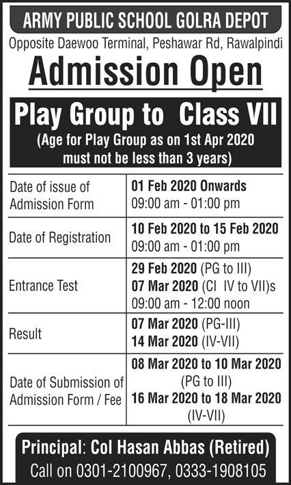 Army Public School Golra Depot announced the Admission for the session of 2020. The Army Public School Golra Depot has now starts the Admission in the Play Group to VII.The last date of submission of form is 8th March, 2020.