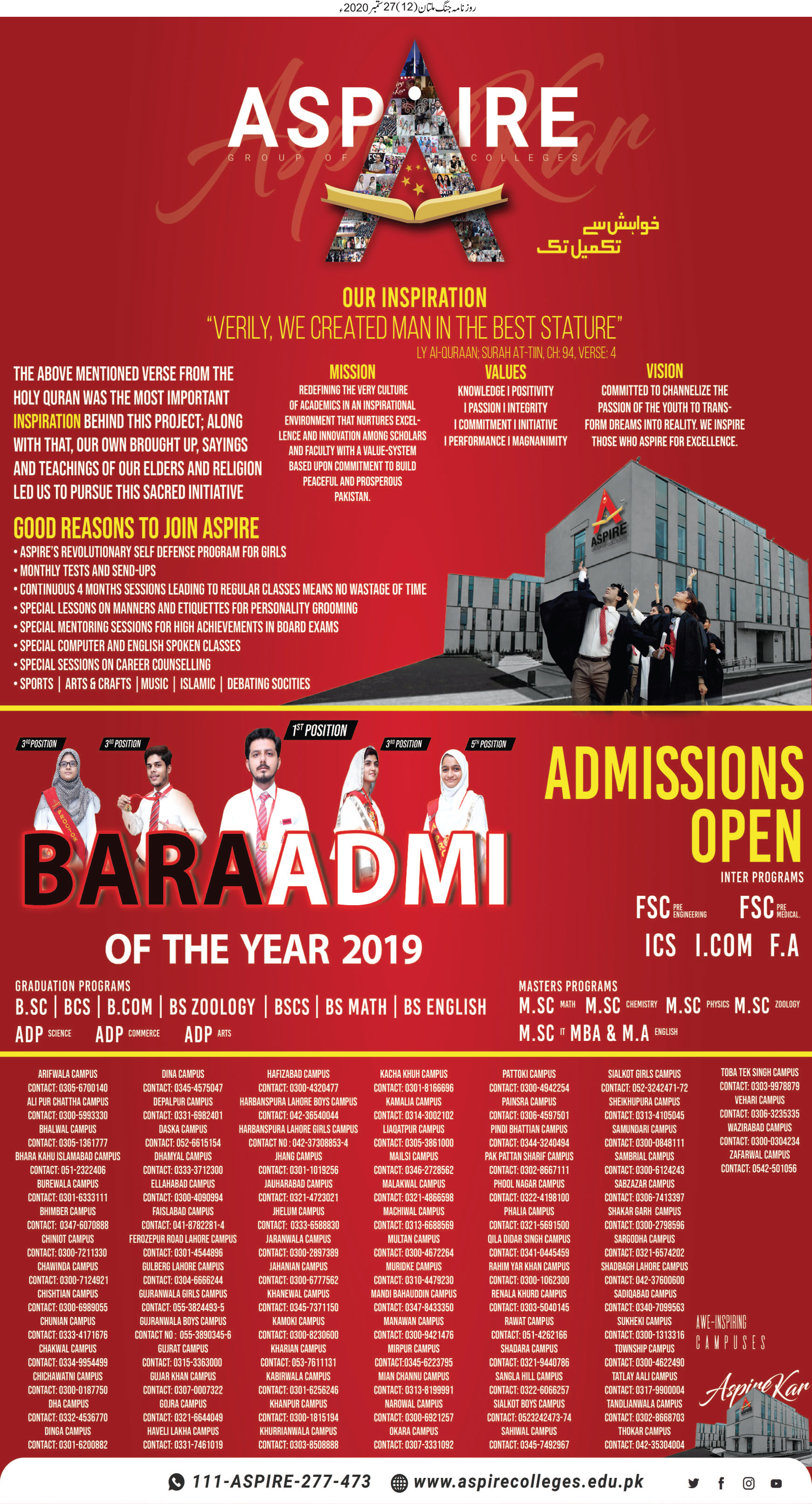 Aspire College BA BSc B.Com ADP Admissions 2020