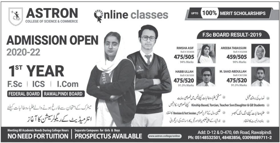 Astron College of Science & Commerce invites applications for admissions in 1st year FSc, ICS and I.Com in Rawalpindi. 100 percent scholarships are available.
