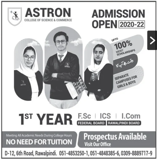 Astron College of Science & Commerce invites applications for admissions 2020 in 1st year FSc, ICS, ICOM in Rawalpindi. 100 Percent Scholarships available. Separate Campus for Girls and Boys.