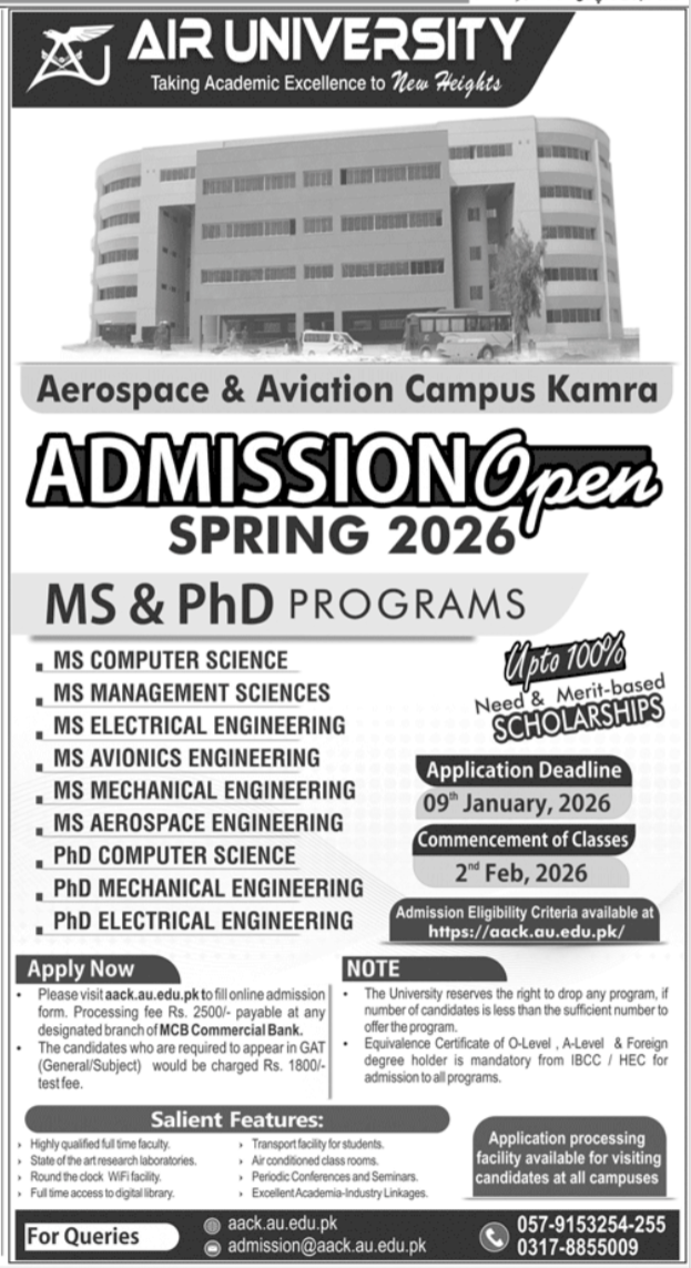 Air University is now accepting applications for Spring 2026 at its Aerospace & Aviation Campus Kamra. The university offers a range of MS and PhD programs designed to develop advanced skills, research capabilities, and professional expertise in engineering, management, and computer sciences.