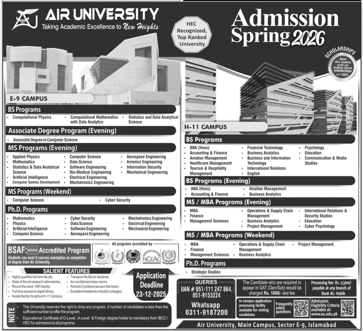 Air University—recognized by HEC and consistently ranked among Pakistan’s top universities—is now accepting applications for Spring 2026. With a commitment to academic excellence, research innovation, and professional development, Air University offers a broad spectrum of programs across science, technology, engineering, management, and social sciences.