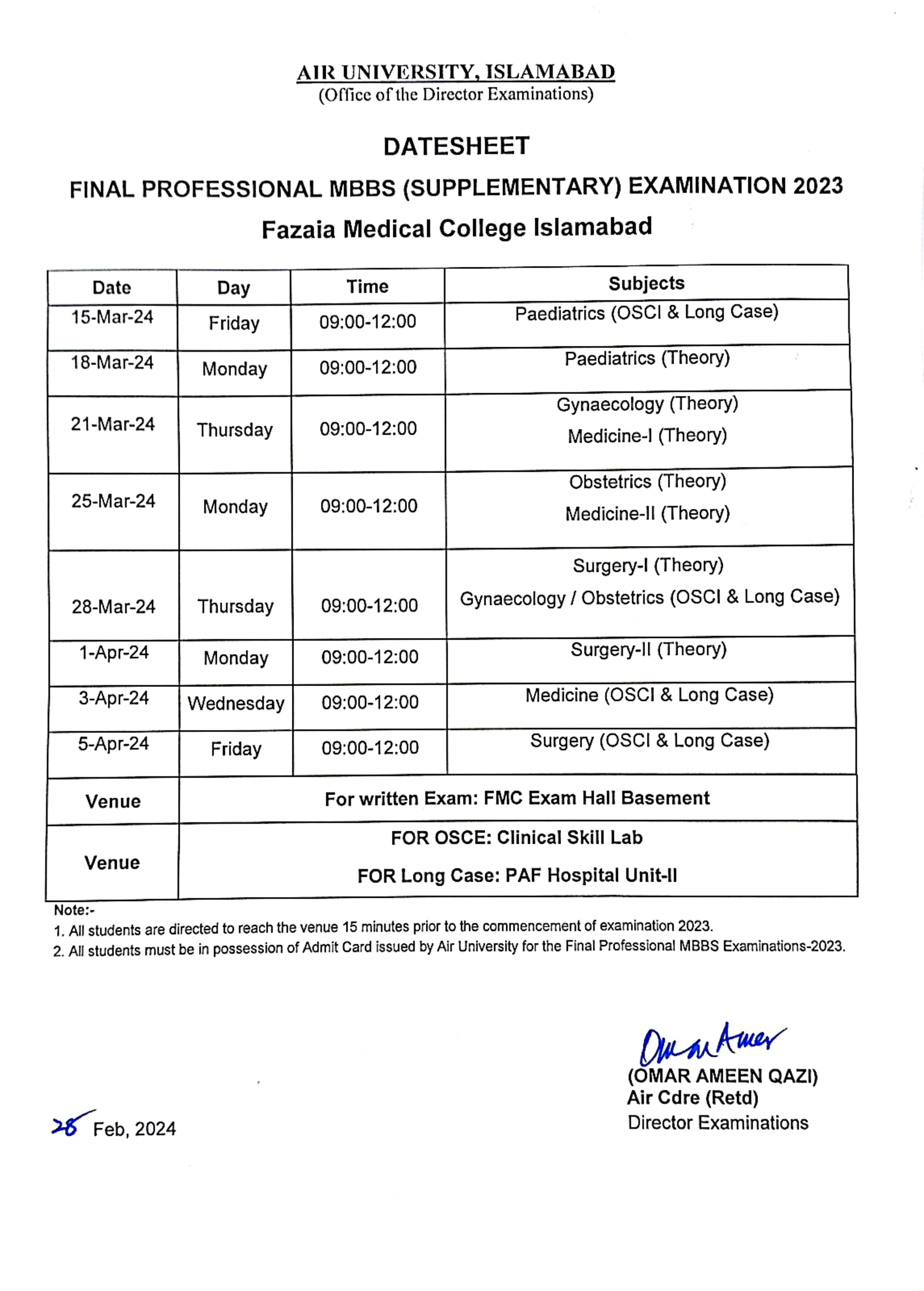Examination Venue: The examinations will be conducted at Fazaia Medical College, providing a conducive environment for students to demonstrate their knowledge and skills. This venue underscores AUs dedication to ensuring high standards of examination administration and integrity.