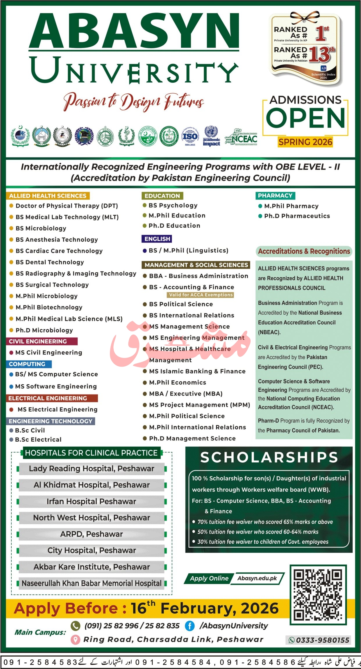 The Abasyn University is offering a wide range of programs in Allied Health Sciences, Engineering, Computing, Education, English, Management & Social Sciences, and Pharmacy. Popular programs include Doctor of Physical Therapy, BS Medical Lab Technology, BS Computer Science, BBA, Civil and Electrical Engineering, Psychology, and various MS, MPhil, and PhD programs. Many students are actively searching for AUI Admissions for UG & PG Programs 2026, highlighting strong demand for Abasyn University’s academic offerings.
