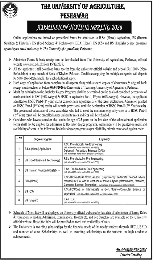 The University of Agriculture, Peshawar AUP has officially announced admissions for Spring 2026 for various undergraduate degree programs. Prospective students are invited to submit online applications.