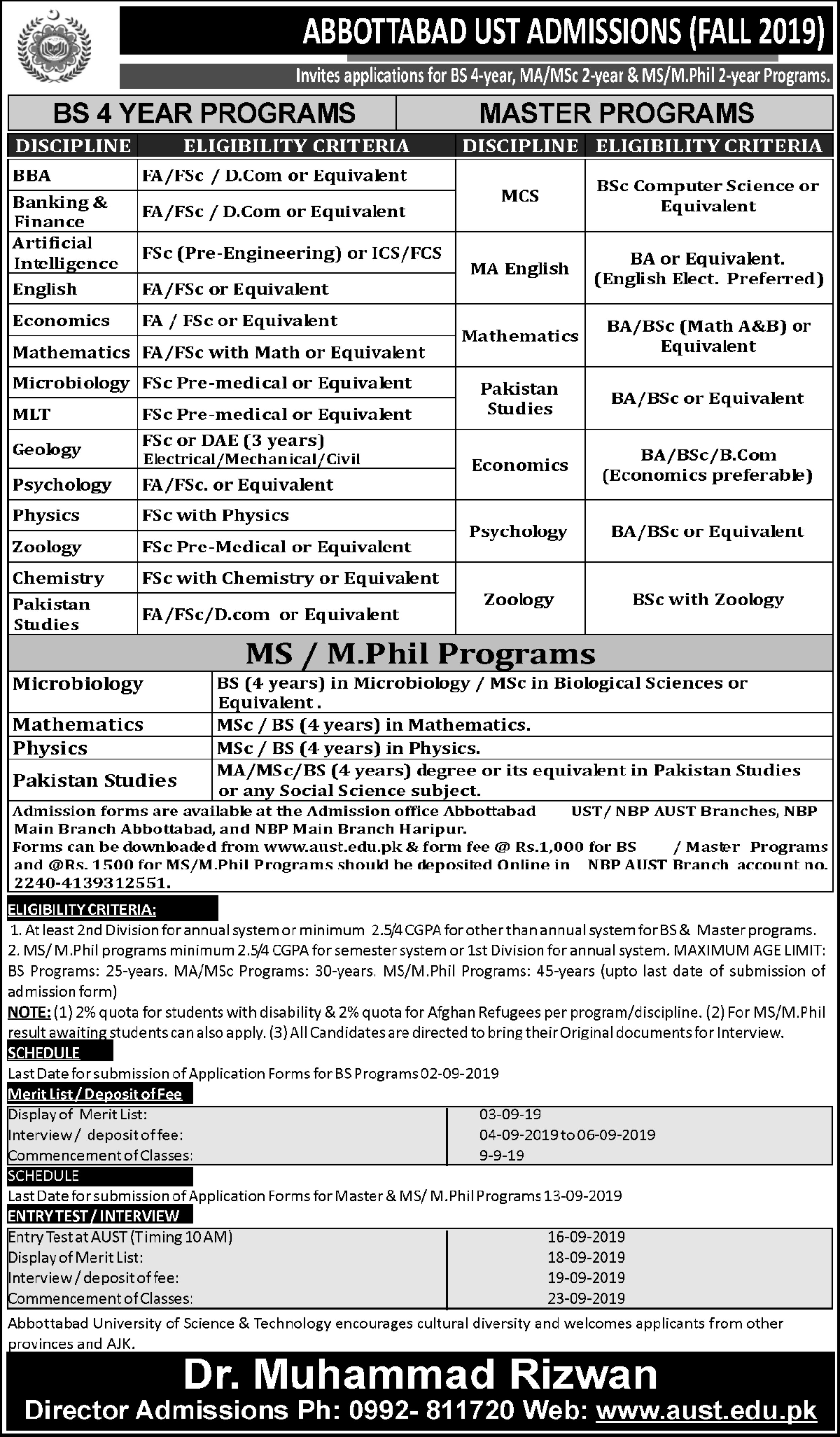 Abbottabad University of Science & Technology has announced admissions for BS in English, Mathematics, Physics, Chemistry, Zoology, Psychology, Microbiology, Economics, MA English, MS/M.Phil in Microbiology, Physics, Mathematics, Pakistan studies. Display of Merit list 03 Sep 2019. Entry test 16 Sep 2019.