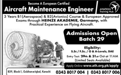 Aviation Training Hub Karachi has offered admissions for Aircraft Maintenance Engineer Course. Duration of course will be 3 Years. Matric, FSc students are eligible to apply. Entry test date is 31 Oct 2019. Limited seats are available.