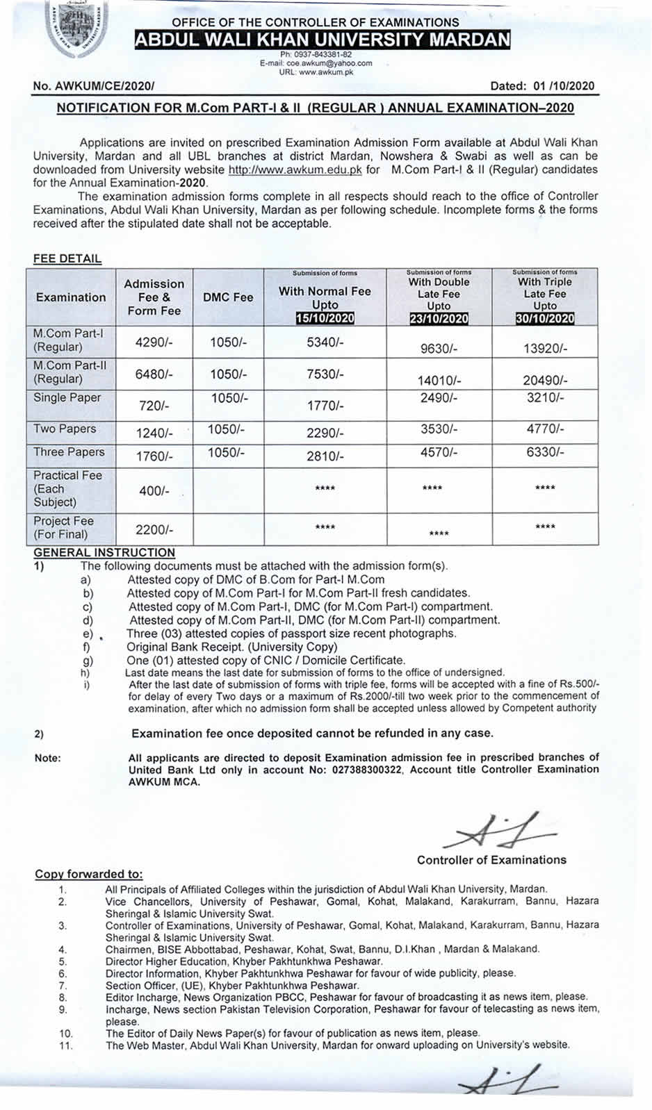 AWKU Mardan M.Com Annual Exams 2020 Admission Schedule