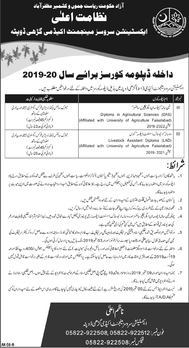 Azad Govt. of state of Jammu & kashmir Deploma courses 2019