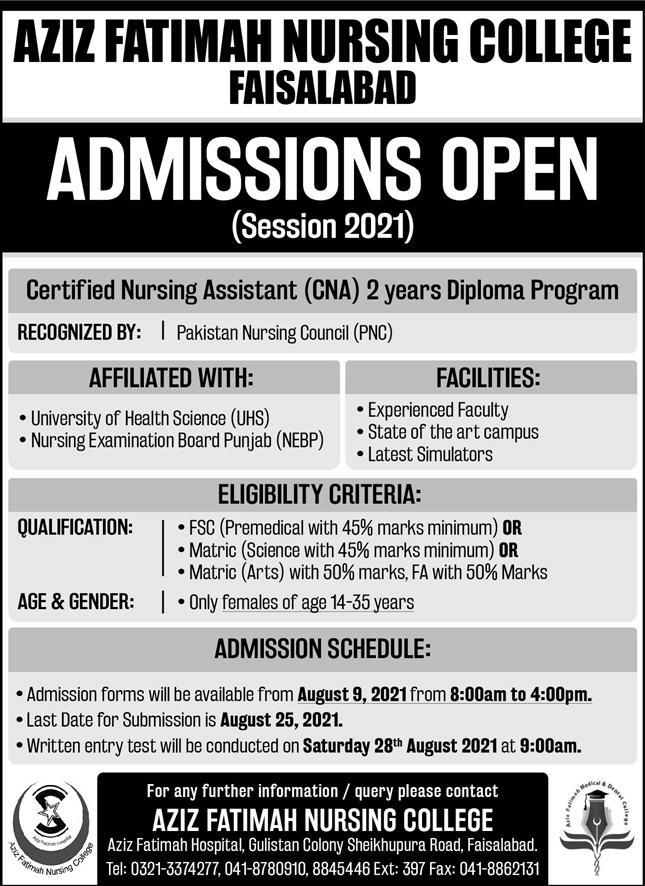 Aziz Fatimah Nursing College AFNC Faisalabad Recognized by Nursing Council PNC is inviting Applications of Admissions in Certified Nursing Assistant CNS 2 years Diploma Program. Candidates having FSc Pre-Medical with 45% marks or Matric in Science and Arts with 45% marks are eligible to apply. Last date to apply is August 25, 2021. Written Test will be held on August 28, 2021. Admissions are open for Session 2021.
