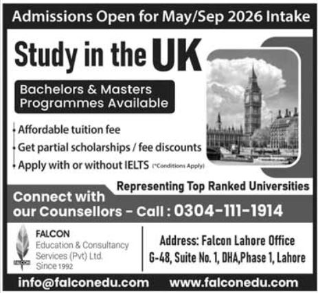 As the global academic calendar shifts toward the next intake, Falcon Education & Consultancy Services Pvt Ltd. has officially announced that admissions are now open for the May and September 2026 cycles. Established in 1992, the consultancy serves as a bridge for Pakistani students aiming to "Study in the UK" at top-ranked institutions.