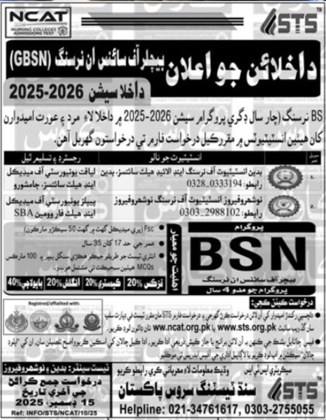 The Badin Institute of Nursing & Allied Health Sciences, Jamshoro, and the Nushero Feroz Institute of Nursing, Nushero Feroz, are now accepting applications for admissions 2025-26 for the Bachelor of Science in Nursing BSN 2025-2026 session. Admissions are open for both male and female candidates.