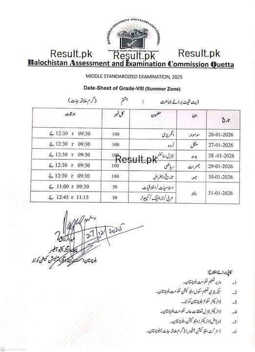 BAEC Quetta 8th Class Standardized Examination 2025 – Summer Zone Date Sheet