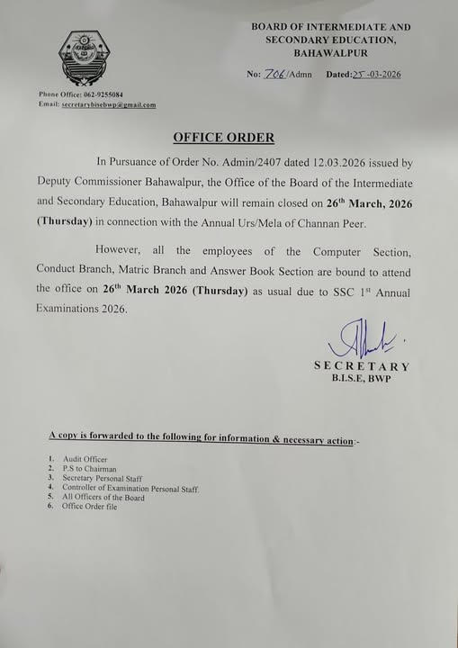 Board of Intermediate and Secondary Education Bahawalpur has announced that the board office will remain close on 26 March 2026 on the issue of the order of the Deputy Commissioner Bahawalpur. The Bahawalpur board has also announced that the annual Urs / mela Channan Peer, a local saint will be celebrated on 26-03-2026 and the holiday is announced locally in this city. The board office will be closed for any academic and official activities and the staff will not attend the office. The students, admin staff of the board and the teaching staff will note BISE Bahawalpur Closes on 26 Mar due to Annual Urs of Local Saint.