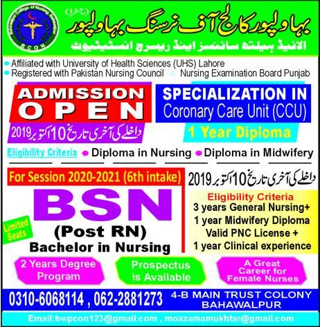 Bahawalpur College of Nursing BS admissions 2019