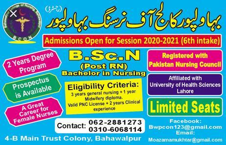 Bahawalpur College of Nursing announced admission in B.Sc.N(Post RN) Bachelor of Nursing. 2 year Degree program, Limited seats are available. Registered with Pakistan Nursing Council.