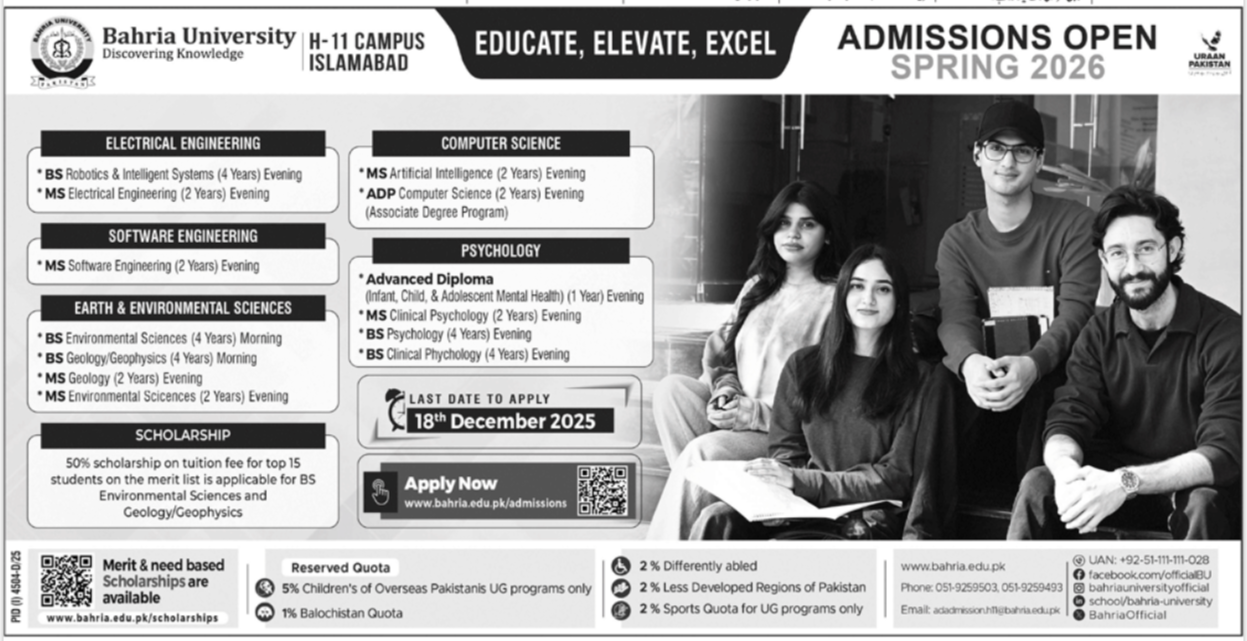 Bahria University H-11 Campus, Islamabad, is now accepting applications for Spring 2026. The university offers a diverse range of undergraduate, graduate, and diploma programs, equipped with modern facilities, experienced faculty, and a vibrant campus environment designed to prepare students for professional success.