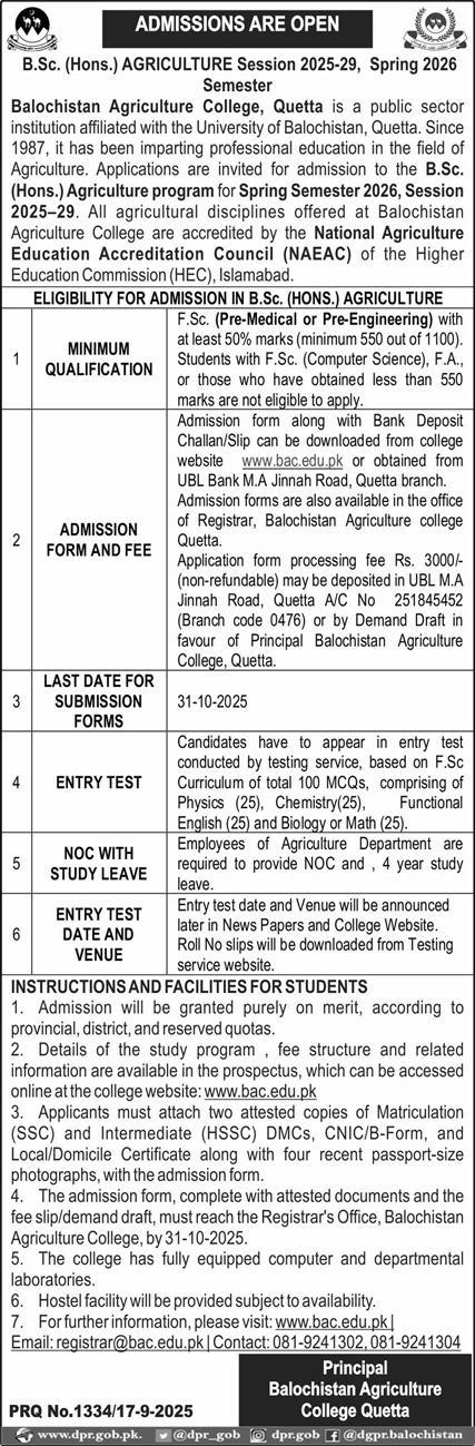 Balochistan Agriculture College Admissions 2025 BSc Hons